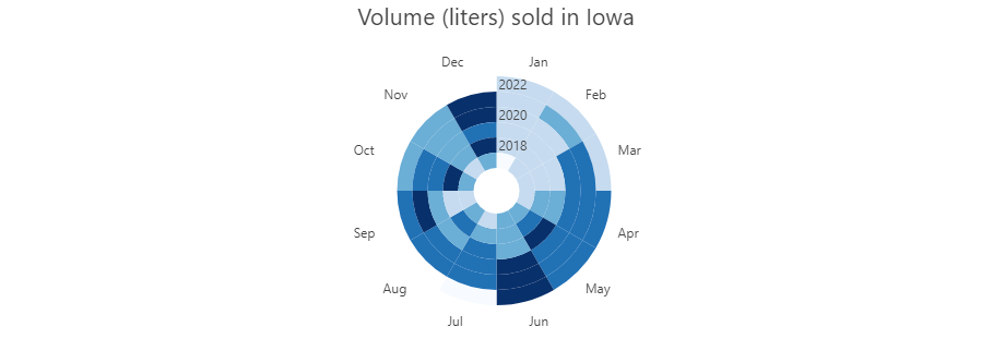 Focusing on sales of alcohol over the state of Iowa, the follwowing raph shows that yearly sales follow a normal seasonal pattern, with annual increases in sales during June and December. Perhps this pattern is better shown in the clock date graph that contains the volume of alcohol sold each month in Iowa during the past 5.5 years by month (there is no data for july-Dec 2022):