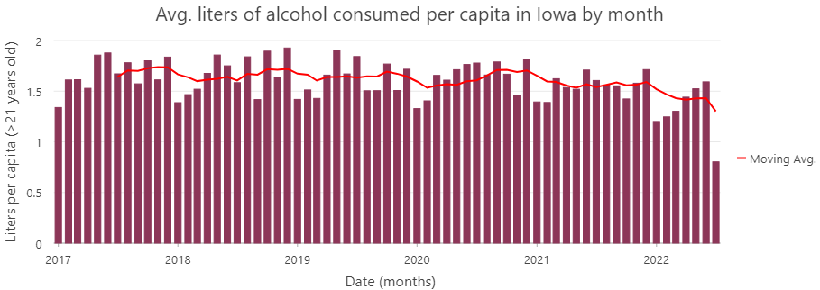Alcohol sales and consumption are two components of Iowa's social and economic landscape. Not only does Iowa produces corn for industrial ethanol (4.5 billion gallons in 2022, contributing with over 25% to total U.S. ethanol production of ~17.5 billion gallons). But it is also home to many breweries, distilleries and wineries that produce alcohol for human consumption. This analysis focuses on the latter, but does not include beer and wine.