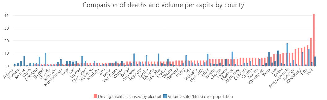 1. A weaker than expected relationship betwen the health related metrics (excessive drinking and deaths by alcohol impaired driving, both relative and total) and alcohol sales in the state of Iowa was found.