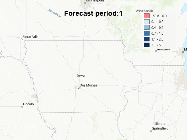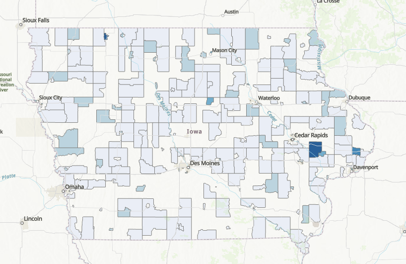 The resulting forecasts (displayed next) have many missing tracts, some of them of great relevance, such as the one in the proximity of Des Moines, or Waterloo.