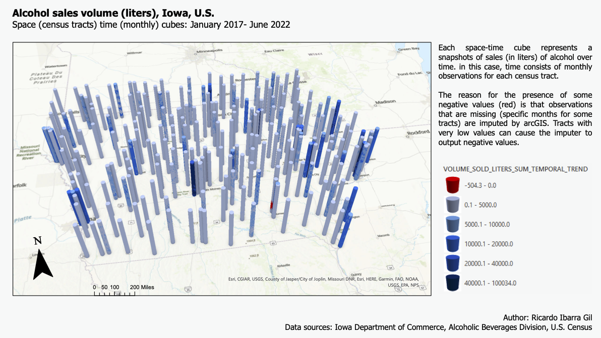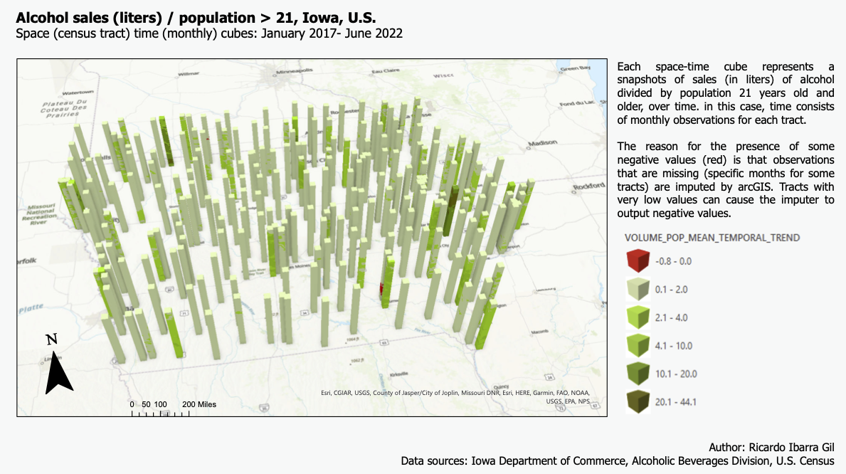 We now enter the space time analysis of the sales and health data. One of the main reasons of this project was to gain experience on the creation and analysis of space time cubes; in this case, those were built for alcohol sales first at the census tract level.